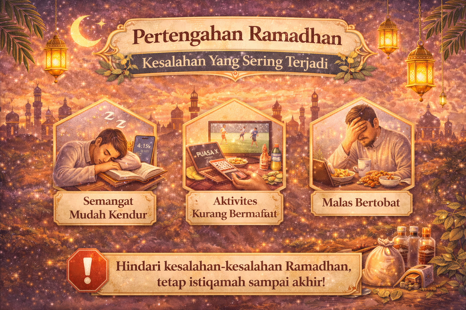 Kesalahan paling umum adalah turunnya intensitas ibadah. Tilawah yang awalnya satu juz per hari menjadi setengah juz, lalu menjadi beberapa halaman. Padahal Rasulullah ﷺ justru meningkatkan ibadahnya, terutama mendekati akhir Ramadhan.