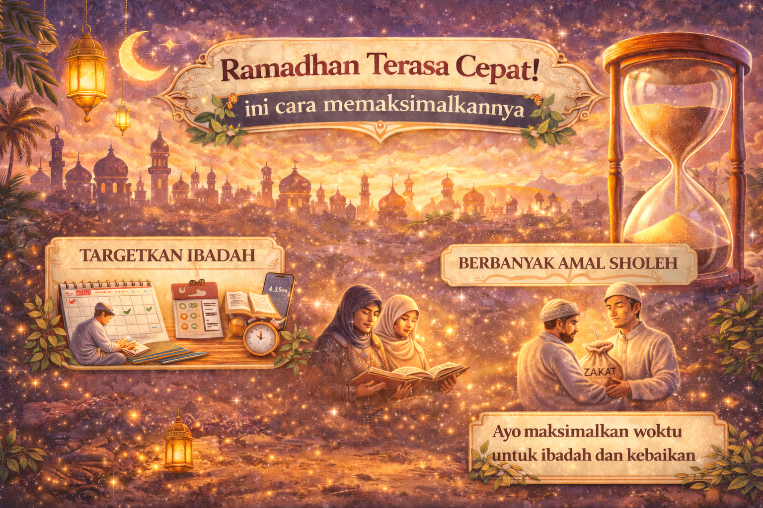 Mengapa waktu Ramadhan terasa cepat berlalu? Faktanya, waktu adalah sesuatu yang tidak pernah kita genggam tapi ia adalah sesuatu yang kita miliki bahkan sampai hari ini. Anehnya, semakin bertambah usia semakin terasa singkat pula waktu yang kita miliki. Salah satu penyebab waktu terasa cepat adalah rutinitas yang padat, ditambah lagi hati dan fikiran kita terisi banyak aktivitas. Terlebih di zaman serba teknologi ini, dimana secara tidak sadar kita sering menghabiskan waktu untuk berseluncur di media sosial.